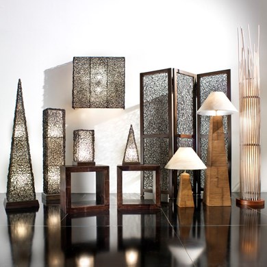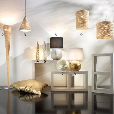 Lampade etniche realizzate in midollino con inserti in resina, da design moderno, ideali per l'illuminazione degli ambienti.