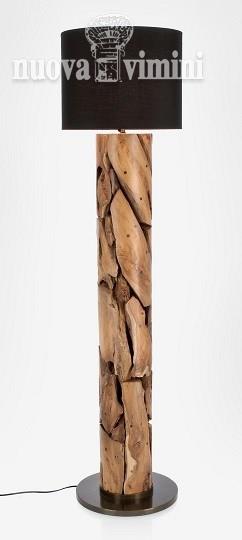 Legno di teak riciclato, finitura naturale. Base in metallo, paralume in cotone.