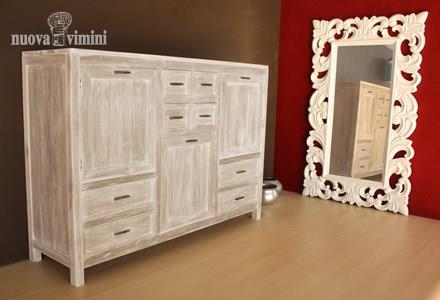 Mobile buffet alto 3 ante 8 cassetti decapato bianco 155 x 45 h 110 cm