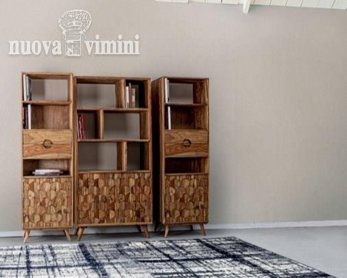 Struttura in legno sheesham, schienale e fondo cassetti in compensato. Finitura naturale. Pomelli in acciaio.
