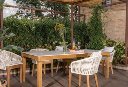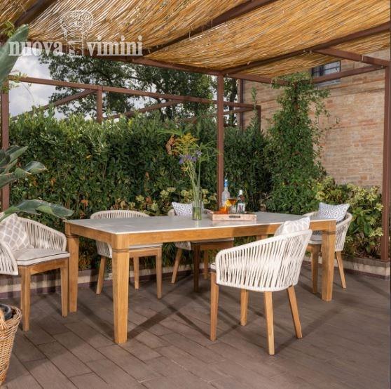 La struttura è realizzata artigianalmente utilizzando vero teak massiccio con finitura spazzolata completamente naturale. Piano in ceramica.