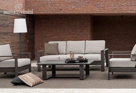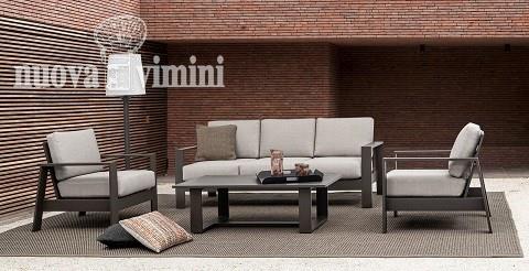 Alluminio verniciato a polvere (poliestere). Cuscini seduta e schienale sfoderabili con tessuto olefin (100% polipropilene). Piedini regolabili. Viteria in acciaio inossidabile. Da assemblare.